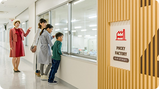 ポッキーの製造工程が見学できます。ずらりと並ぶポッキーからついつい目が離せなくなります。見学を終えると、ポッキーがさらに身近に感じられます。